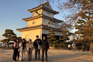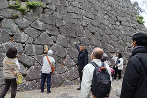 本講座は、多様な専門性を有する社会共創学部の複数の教員が各回を担当する一般向けのプログラムです。第1回を担当し、「近世城郭の見方・歩き方」と題した松山城現地説明会を実施しました。黒門跡から登城し石垣や筒井門、天守など各所で説明を行い、石垣や天守内部では当研究室の学生も解説を行いました