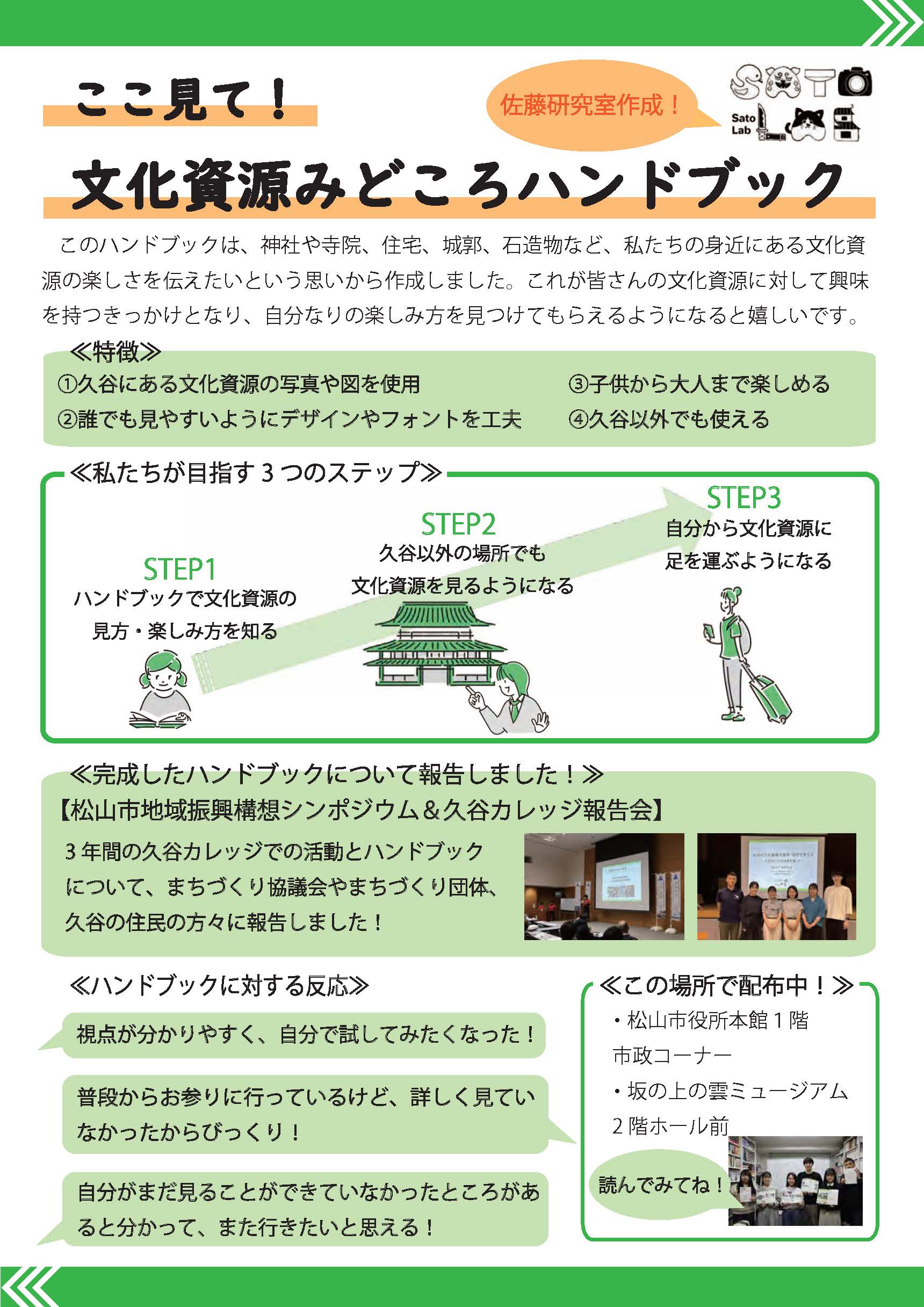 この冊子は、久谷地区で催されるイベントなどで配布するほか、松山市役所本館1階市政コーナー、坂の上の雲ミュージアム2階ホール前で配布中です。学内の方は、佐藤にお問い合わせください。