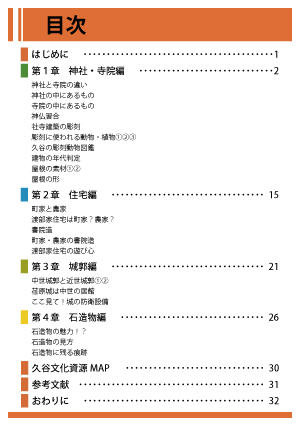 このハンドブックは「フィールドミュージアムアカデミー久谷カレッジ」の一環で作成したもので、松山市久谷地区にある建造物・石造物の写真を使って構成しています。日頃の授業や巡検、フィールドワークで見たもの、聞いたことのなかから、特に人に伝えたいという項目を厳選しました。皆様の身のまわりにある神社や寺のほか、旅行で城などを訪れた際にも役立つ一冊となっています。 是非、ご覧になってください。